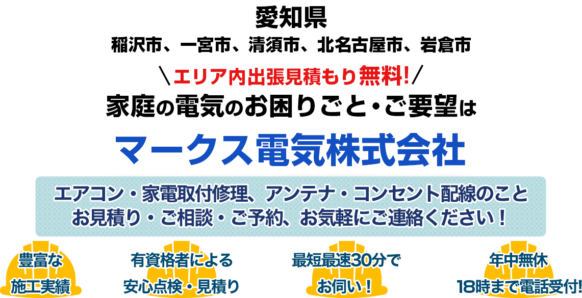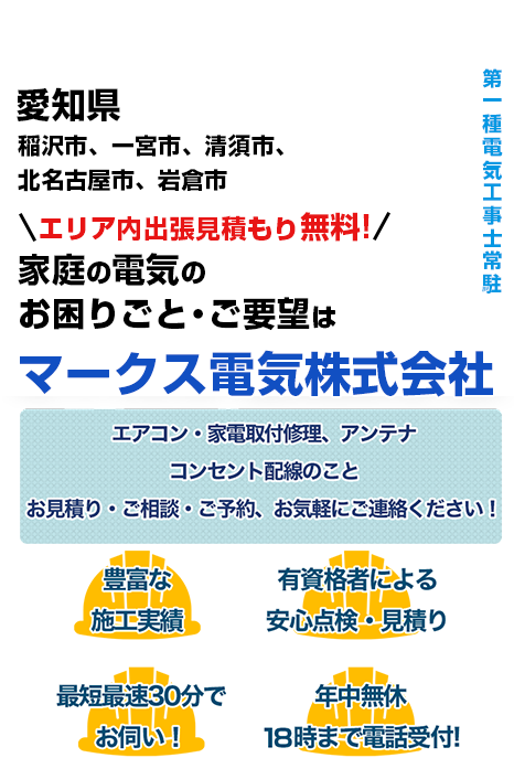 電気工事やエアコン修理のことなら、マークス電気株式会社へお任せください! スイッチやコンセント、ブレーカー(分電盤)や照明、アンテナなどなど、電気工事全般幅広く対応可能です。